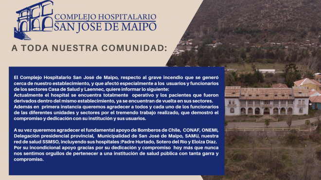 El Complejo Hospitalario San José de Maipo, respecto al grave incendio que se generó cerca de nuestro establecimiento, y que afectó especialmente a los usuarios y funcionarios de los sectores Casa de Salud y Laennec, quiere informar lo siguiente: