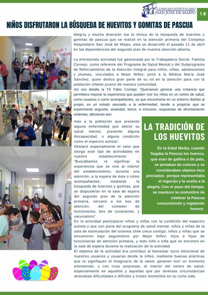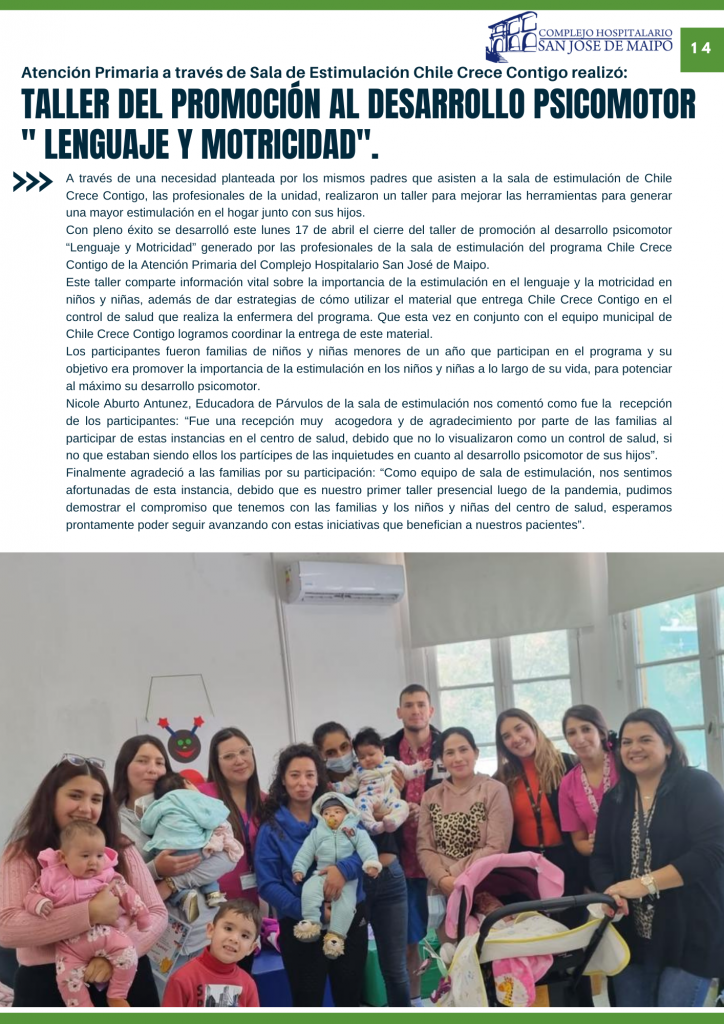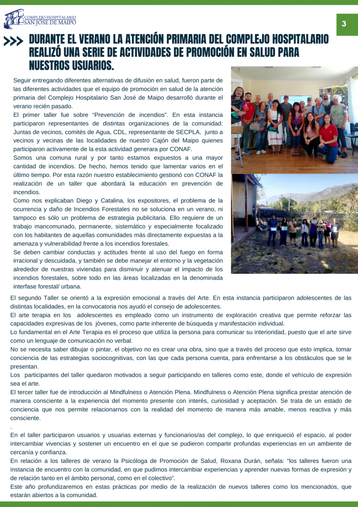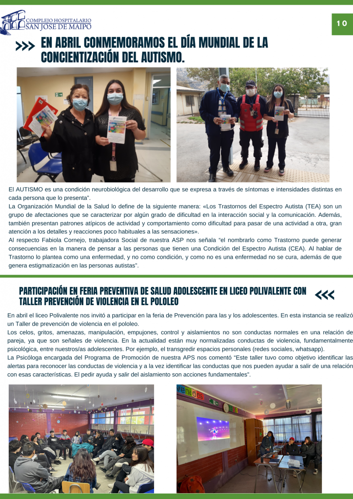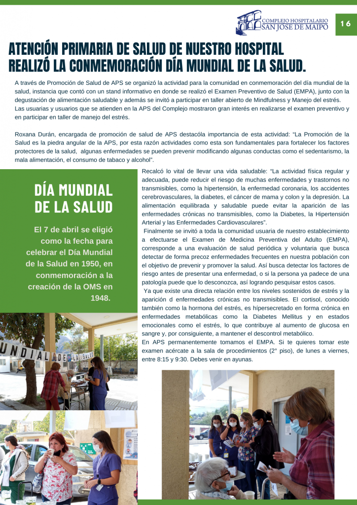Como parte de las actividades de desarrollo en conjunto entre las unidades de Comunicaciones, Gestión del Usuario y el centro de responsabilidad de Atención Primaria y su área de Promoción, compartimos con todos ustedes nuestro Boletín Informativo con todas las novedades, actividades relevantes y también consejos en el área de salud destinado para todos nuestros usuarios, el boletín va adjunto el pdf y también hemos incorporado acceso de link, código QR para poder difundirlo virtualmente