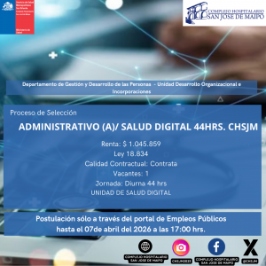 El Complejo Hospitalario San José de Maipo invita a participar en el proceso de selección para el cargo de Administrativo(a) Salud Digital.